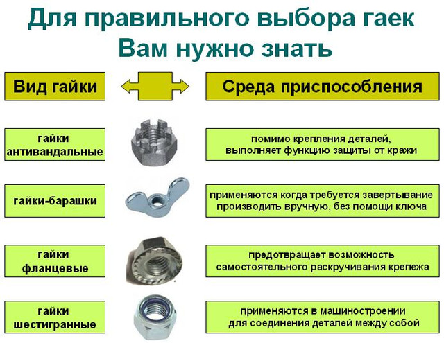 Неіржавке кріплення щільно входить у наше повсякденне життя. Це стосується і неіржавких гайок. Цей кріплення повсюдно застосовується з болтами, шпильками, гвинтами. Іноді використовується разом із шайбами. Для виготовлення неіржавких гайок використовуються різні марки неіржавкої сталі: 08Х13, 03Х17Н14М2, 08Х18Н10, 20Х13, 30Х13. Застосування цих гайок залежить від марки сталі, з якої вона виготовлена. Так, вони можуть використовуватися в кислотних і щадніших умовах.