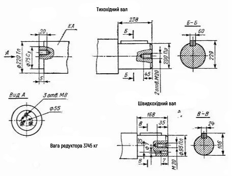 Розміри кінців швидкохідного та тихохідного валу редуктора РЦД-1150