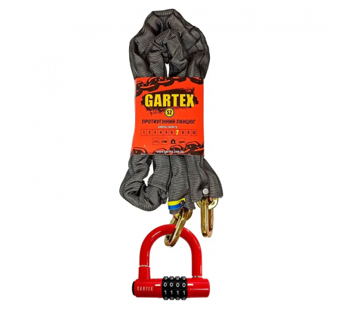 Gartex S2 1500x8 мм-004 оснащен замком, обеспечивающим надежную фиксацию цепи и защиту от открытия. Длина замка позволяет удобно зафиксировать его на раме велосипеда без лишних затруднений.
